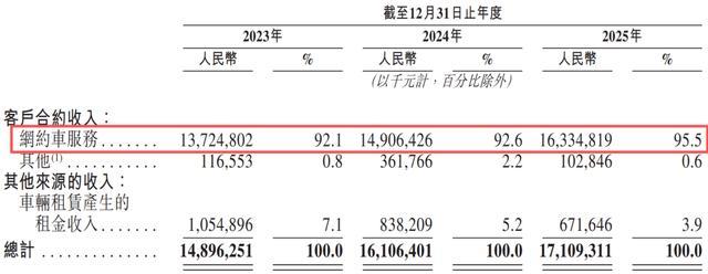 其中,网约车业务贡献收入137.25亿元、149.06亿元和163.35亿元,占总收入的比例始终超过九成。