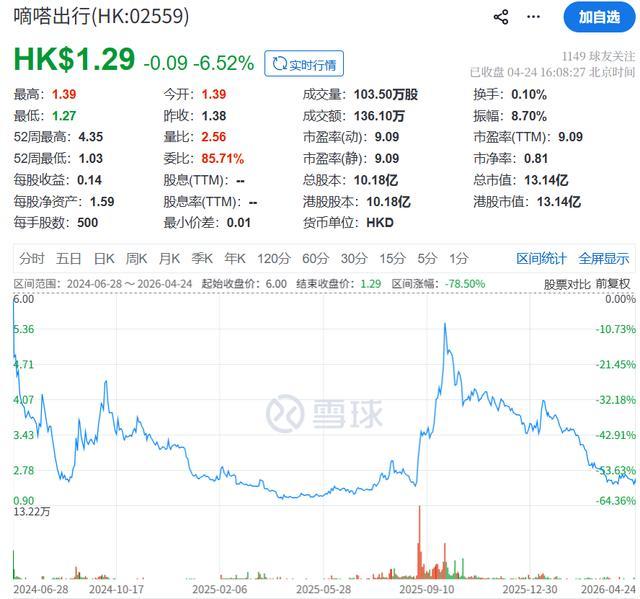截至4月24日收盘,嘀嗒出行股价报1.29港元,2024年上市至今跌去78.50%,公司总市值13.14亿港元。