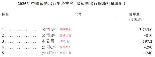 2025年全年,平台促成约7.97亿个订单,交易总额达到188.91亿元。按去年订单量计算,T3出行已成为中国第三大智慧出行平台。