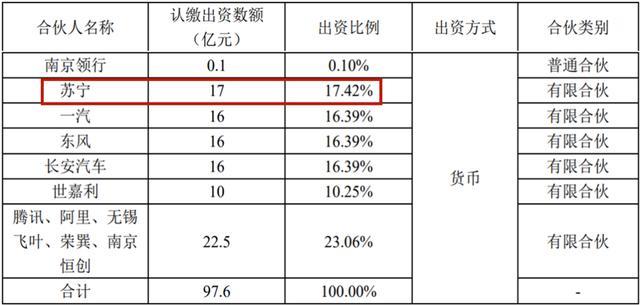 引人注意的是,南京领行合伙企业成立时,作为LP的苏宁认缴出资17亿元,出资比例高达17.42%,比三大车企还高。