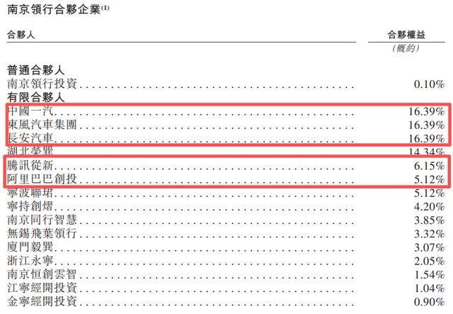 南京领行合伙企业的有限合伙人(LP)中,一汽、东风、长安三大车企均持有16.39%的合伙权益,腾讯、阿里则分别持有6.15%、5.12%。