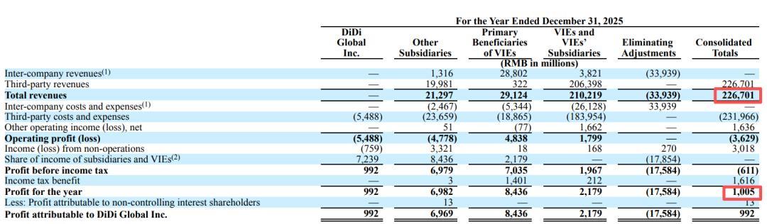 2025年,滴滴实现营收2267.01亿元,净利润10.05亿元,净利率约0.44%。