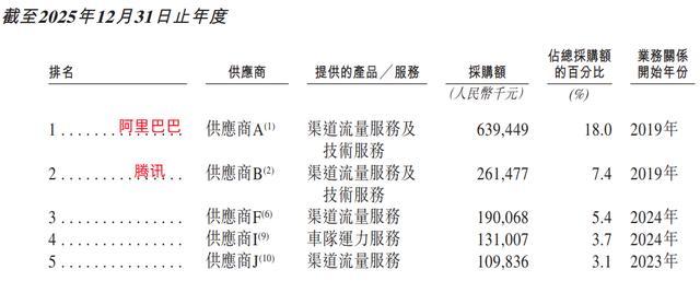 2025年,其向阿里、腾讯采购的金额分别约为6.39亿元、2.61亿元,分别占同期采购总额的18.0%、7.4%。